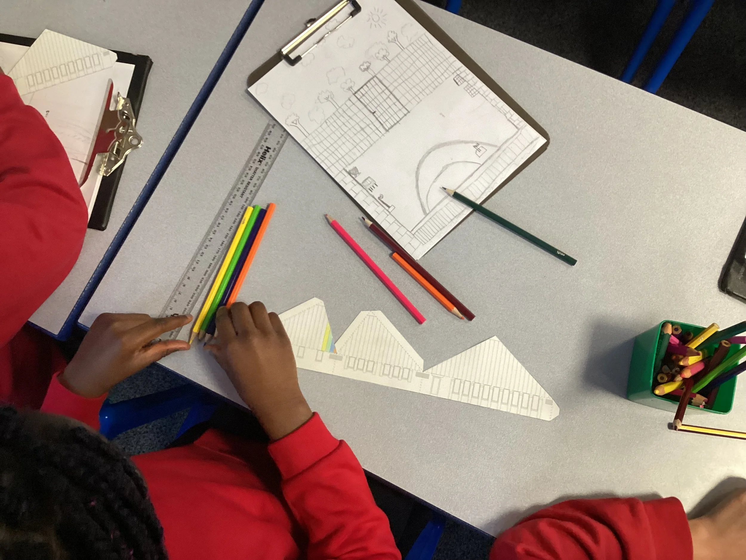 The final challenge asked the children to design their own proposal for a new structure in the front playground, using shapes inspired by the morning activities and the new annex. This exercise not only encouraged creativity but also gave the children a hands-on understanding of architecture and design.